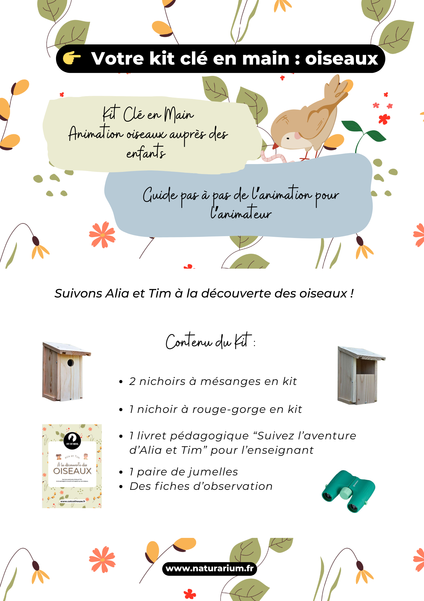 Le + Naturarium : la possibilité de créer un fil rouge avec l’ensemble de nos kits (année 1 sur les oiseaux, année 2 sur les insectes), et de prolonger l’expérience avec l’aménagement concret de vos nichoirs et/ou hôtels à insectes directement dans votre établissement, par nos équipes.