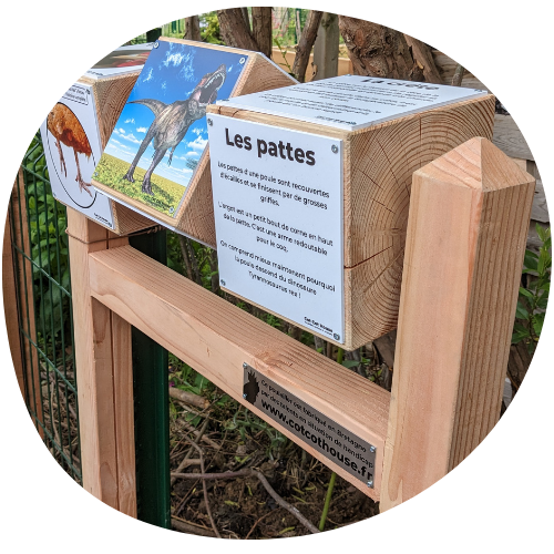 - Une signalétique double face : 4 bonnes raisons d’avoir des poules (écologie, lien social, alimentation durable, nuisibles) ; Tout savoir sur nos amis les poules (origine, races, cycle de vie).
